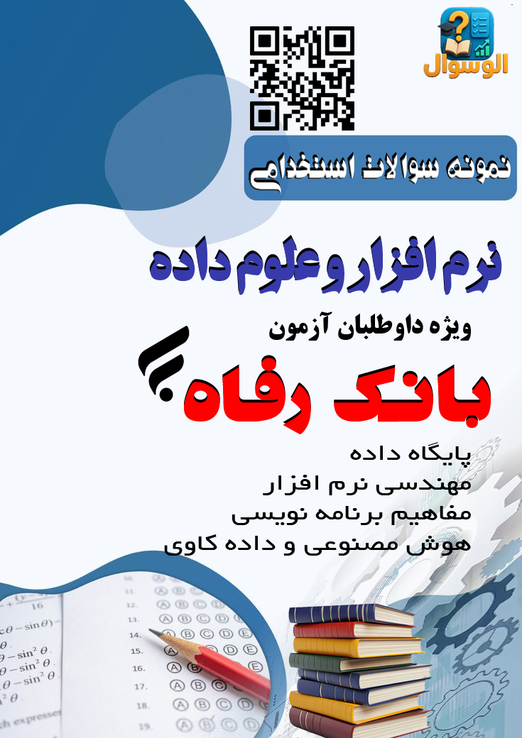 اگر قصد دارید در آزمون استخدامی بانک رفاه کارگران در رشته نرمافزار و علوم داده با موفقیت پذیرفته شوید، این مجموعه کاملترین و مطمئنترین منبع برای شماست. در این بسته، اصل سوالات تخصصی پرتکرار سالهای گذشته به همراه سوالات بهروز و ویژه آزمون جدید گردآوری شده تا هیچ مبحثی از قلم نیفتد.این منبع جامع با پوشش کامل دروس پایگاه داده، مهندسی نرمافزار، مفاهیم برنامهنویسی، هوش مصنوعی و دادهکاوی، داوطلبان را برای کسب بالاترین امتیاز آماده میسازد.با مطالعه این مجموعه ارزشمند، شانس موفقیت و قبولی شما در آزمون استخدامی بانک رفاه کارگران به شکل چشمگیری افزایش خواهد یافت. تیم ما همواره در تلاش است تا بهترین و بهروزترین منابع آموزشی را در اختیار شما قرار دهد و مسیر دستیابی به موفقیت شغلی را برایتان هموارتر کند.